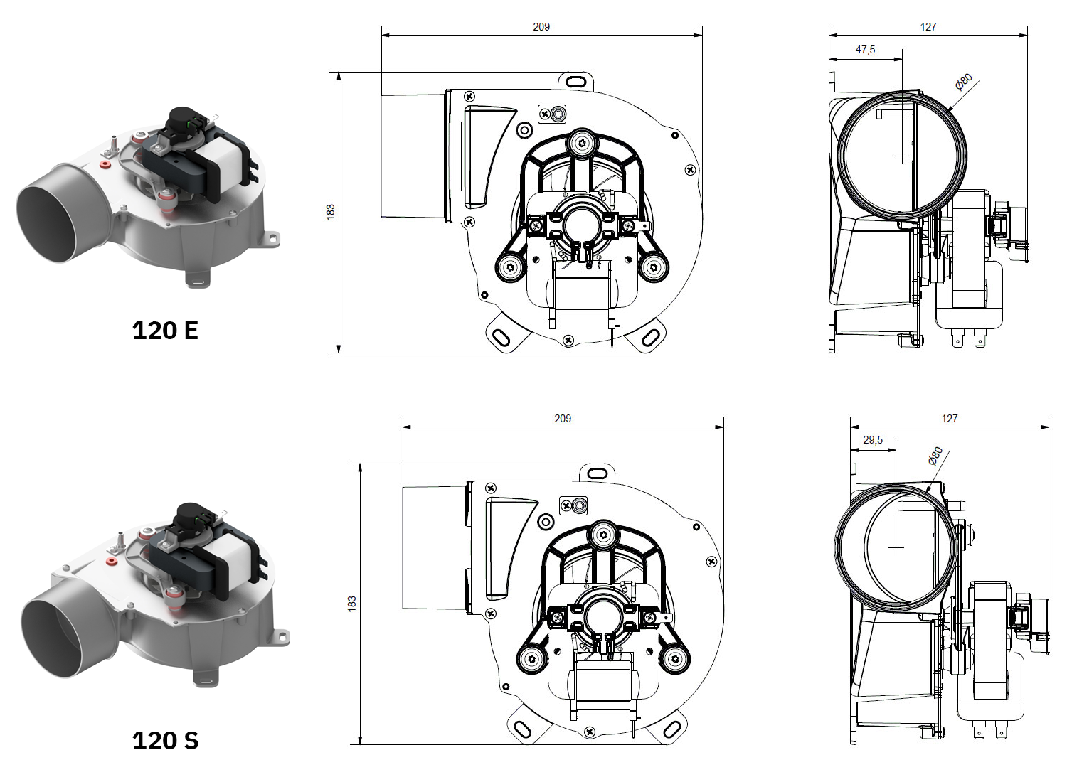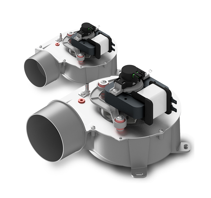 Blower with shaded poles motor available in different air flow rates, aluminized steel scroll and AISI 430 stainless steel impeller.